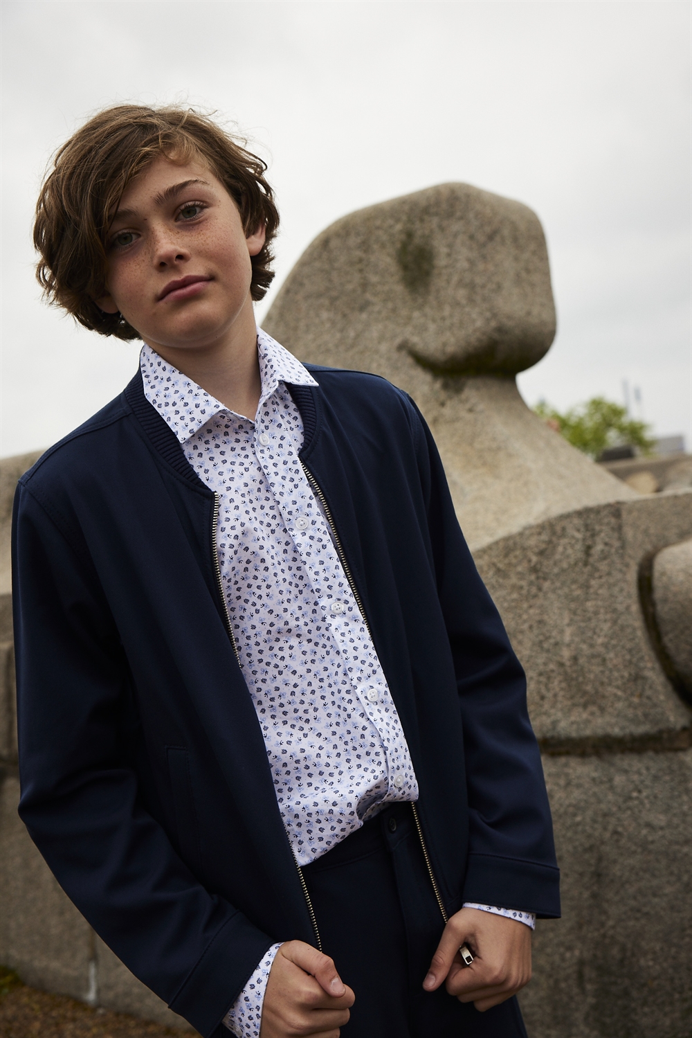 Denne sommerjakke er designet specifikt til drenge og er et must-have i enhver ung modebevidsts garderobe. Jakken er fremstillet i en høj kvalitet blanding af 62% polyester, 33% viskose og 5% elastan, hvilket sikrer både holdbarhed og fleksibilitet.