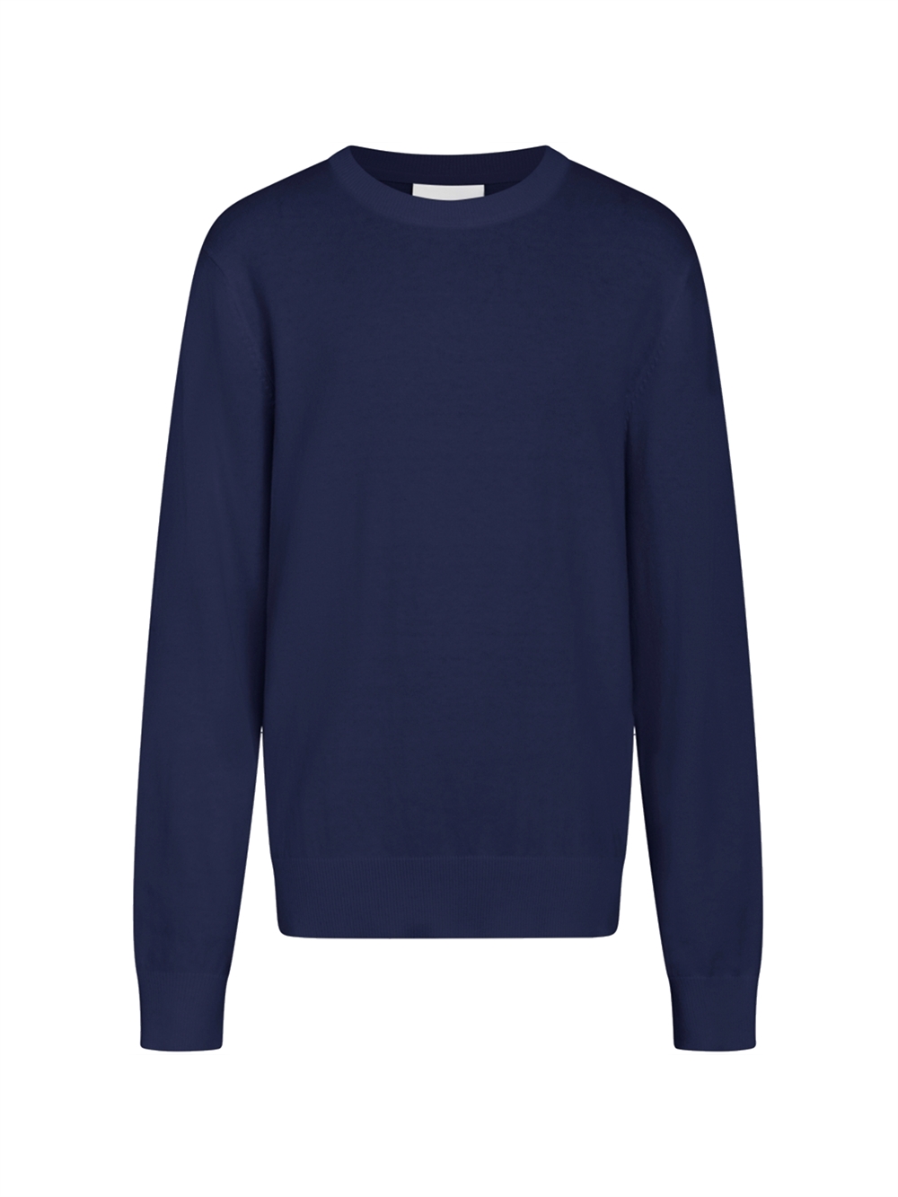 Opdag den perfekte blanding af stil og komfort med Grund Strik Carl Crew Knit i Navy fra GRUNT