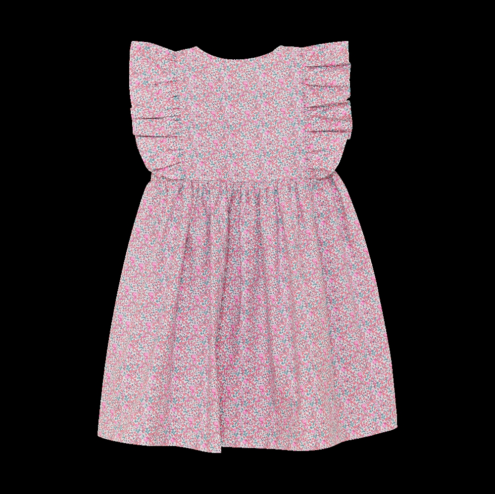 Denne kjole er perfekt til den modebevidste pige, der værdsætter både stil og miljøvenlighed. Fremstillet i det berømte Liberty-stof, er kjolen ikke blot visuelt tiltalende med sit levende mønster i pink og andre nuancer, men også blød og behagelig at have på. Kjolen er designet med en række søde detaljer, herunder gennemgående knapper foran, som tilføjer et touch af klassisk charme.