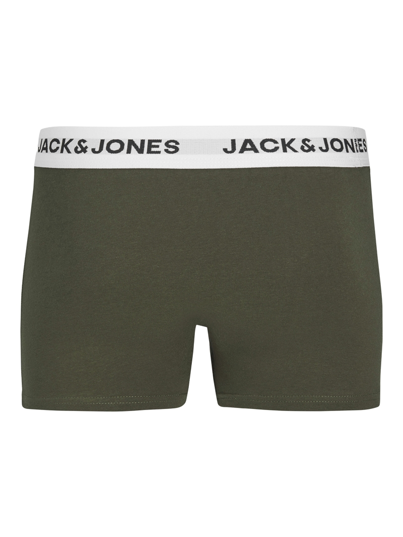 * Brand: Jack & Jones Junior * Produkttype: Trunks (underbukser) * Antal: 5-pack * Farver: 2x sort, grøn, blå og grå * Materiale: 95% økologisk bomuld, 5% elastan * Talje: Elastisk linning