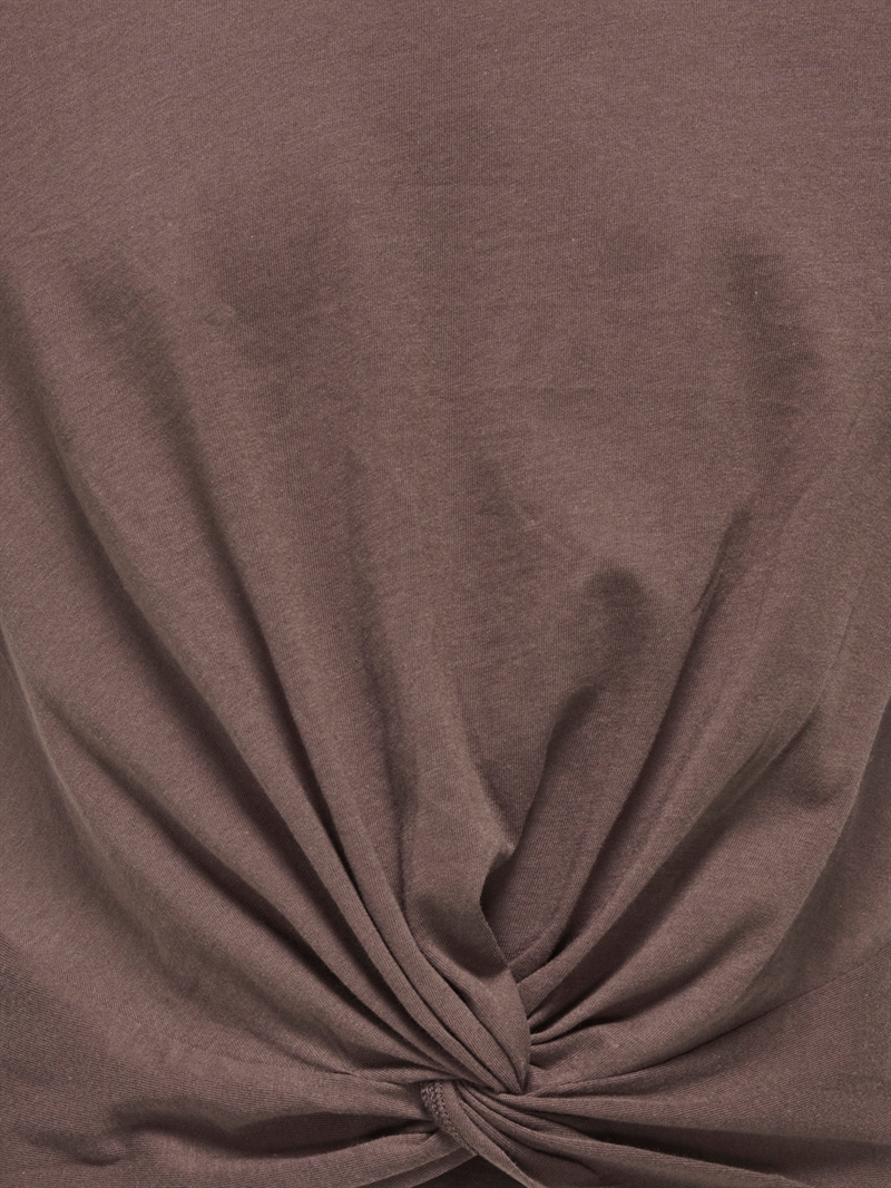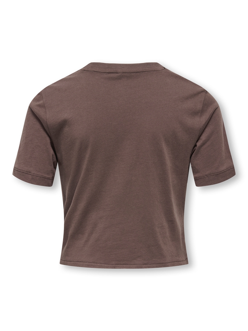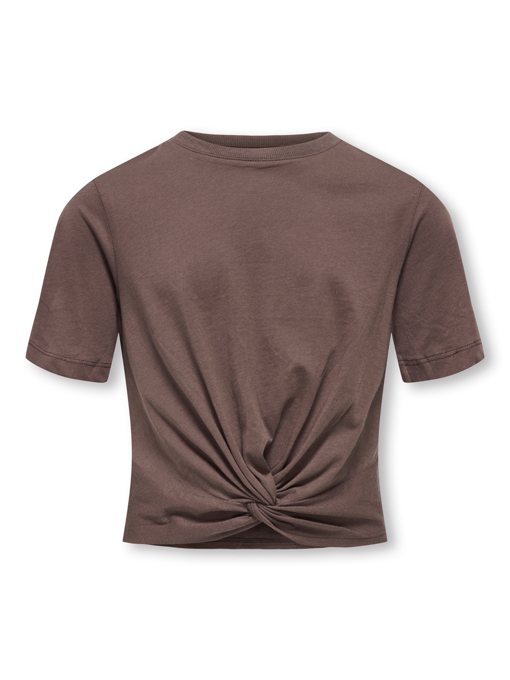 Brand: Kids Only Model: Rex Type: Top / T-shirt Målgruppe: Piger / teen Farve: Brun Materiale: 100% bomuld Pasform: Regular Fit Hals: Rund hals Ærmer: Korte ærmer Detaljer: Twist- og rynkeeffekt