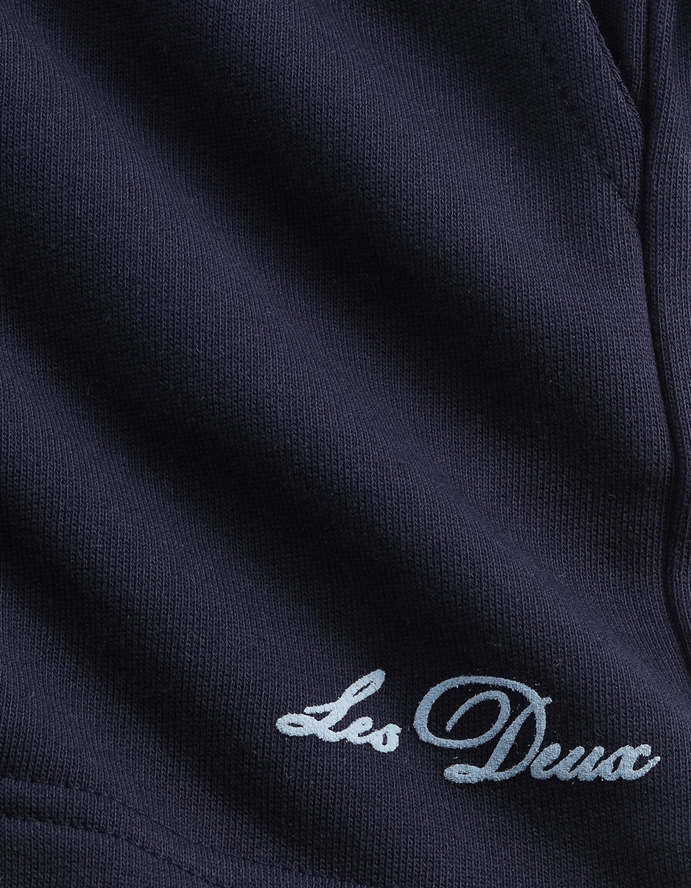'Les Deux Shorts Globe - Dark Navy' er fremstillet i høj kvalitet materialer, som sikrer holdbarhed og en følelse af luksus, hver gang de bæres. Den mørkeblå nuance er ikke kun tidløs, men også praktisk, da den skjuler pletter og er nem at matche med forskellige typer tøj. Shortsene er designet med en behagelig pasform, der giver fri bevægelighed, hvilket er ideelt til en aktiv dag ude.Uanset om det er til en dag i skolen, en tur i parken eller en familiefest, vil 'Les Deux Shorts Globe - Dark Navy' være et sikkert valg, som tilføjer stil og komfort til din drengs garderobe.