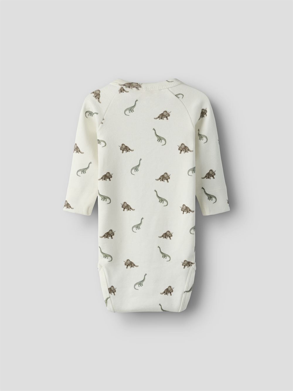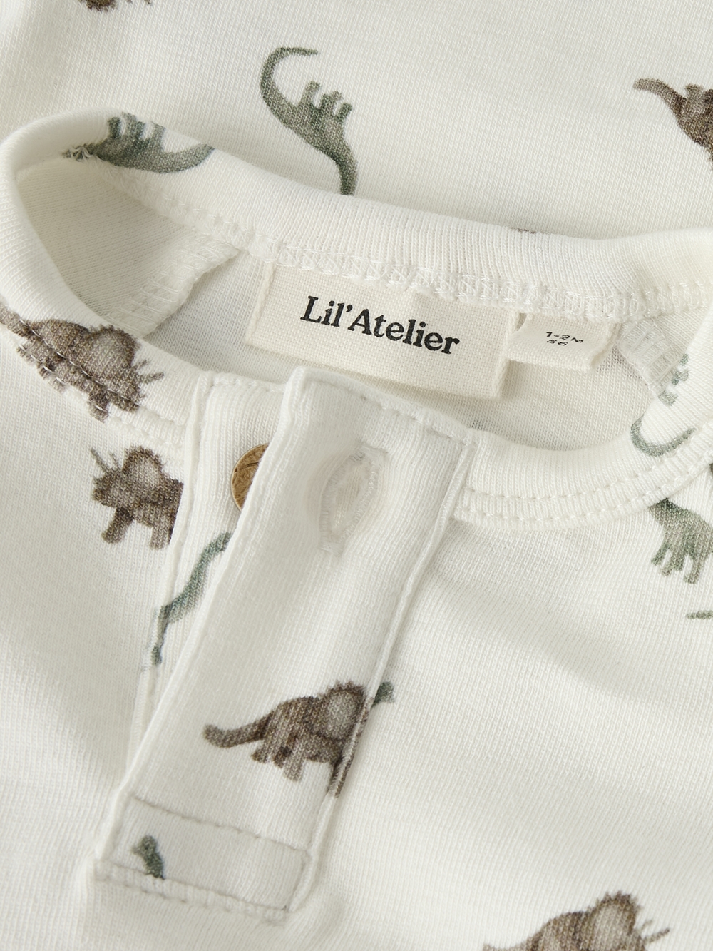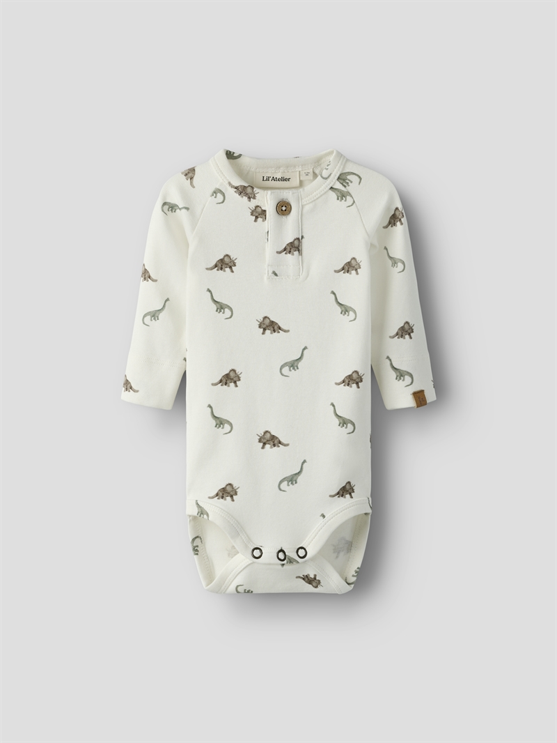 Produktdetaljer: - Produkttype: Bodystocking - Hals: Rund hals - Ærmer: Lange ærmer - Lukning: Knapper på forsiden samt trykknapper i skridtet for nem påklædning - Detaljer: Mærkat med Lil' Atelier logo - Mønster: Dinosaur print gentaget på hele overfladen - Farve: Beige