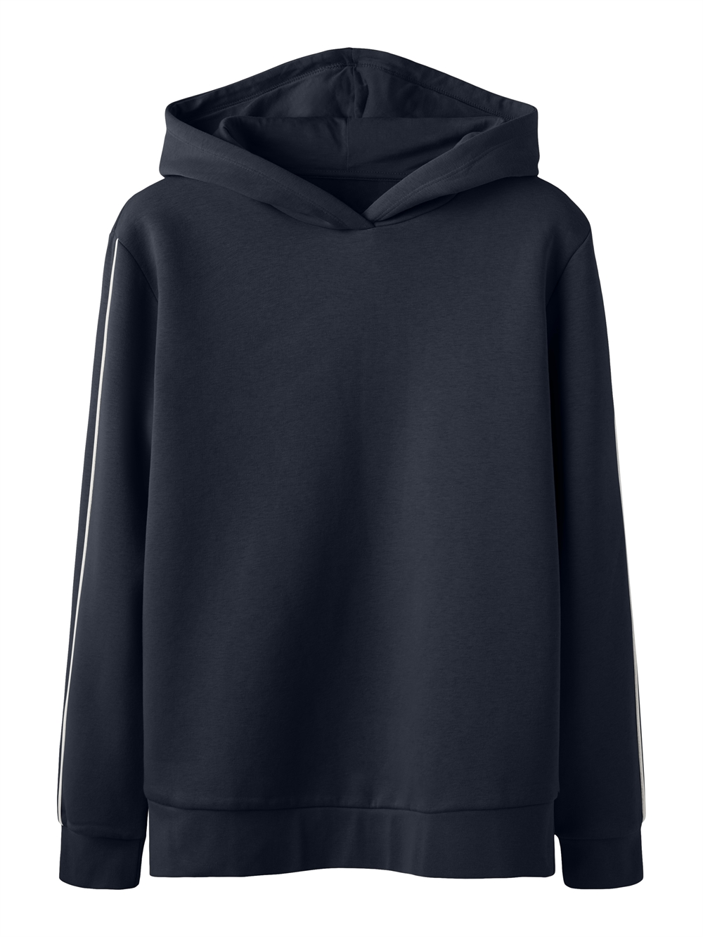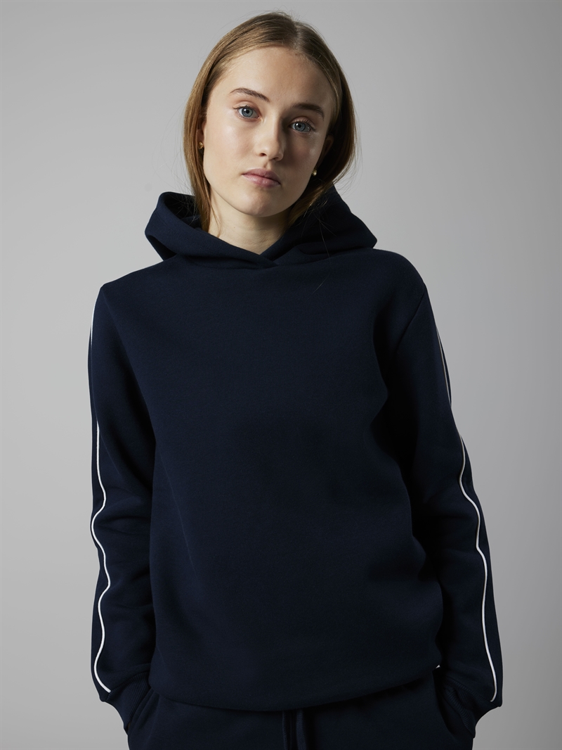 Produkttype: Sweatshirts Hals: Hoodie Ærme: Lange ærmer Ærmedetaljer: Dropped shoulders for et afslappet look Manchetter: Ribbede manchetter Ekstra detaljer: Pipedetaljer for et stilfuldt touch Pasform: Almindelig pasformMærke: LMTD Køn: Pige Kategori: Hoodies Farve: Blå (Dark Sapphire).