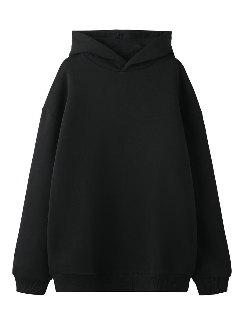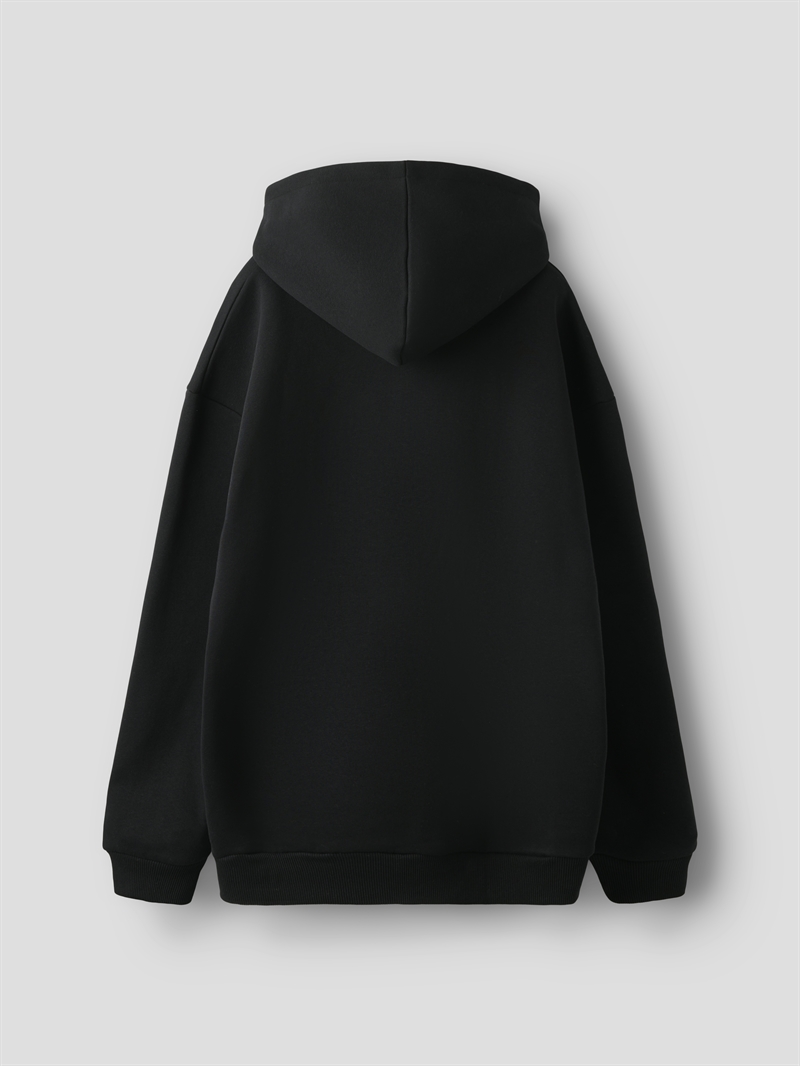 Den sorte farve tilføjer et klassisk og alsidigt touch, så den nemt kan kombineres med forskellige outfits, mens den løse pasform sikrer en afslappet og trendy look. Hoodien er udstyret med en praktisk hætte, der tilbyder ekstra beskyttelse på kølige dage.