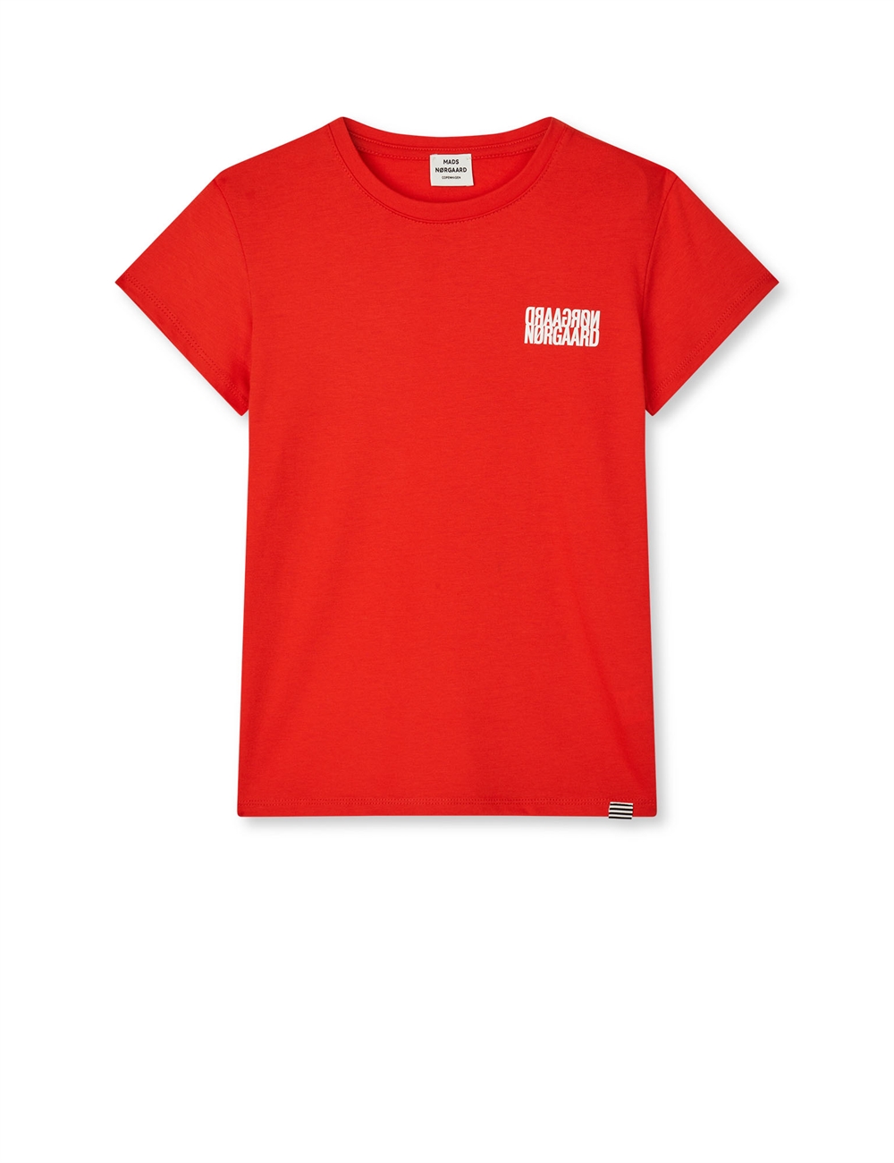 Denne T-shirt fra det anerkendte danske mærke Mads Nørgaard tilføjer et pift af stil til dit barns garderobe med sin iøjnefaldende røde farve, der skiller sig ud på legepladsen.