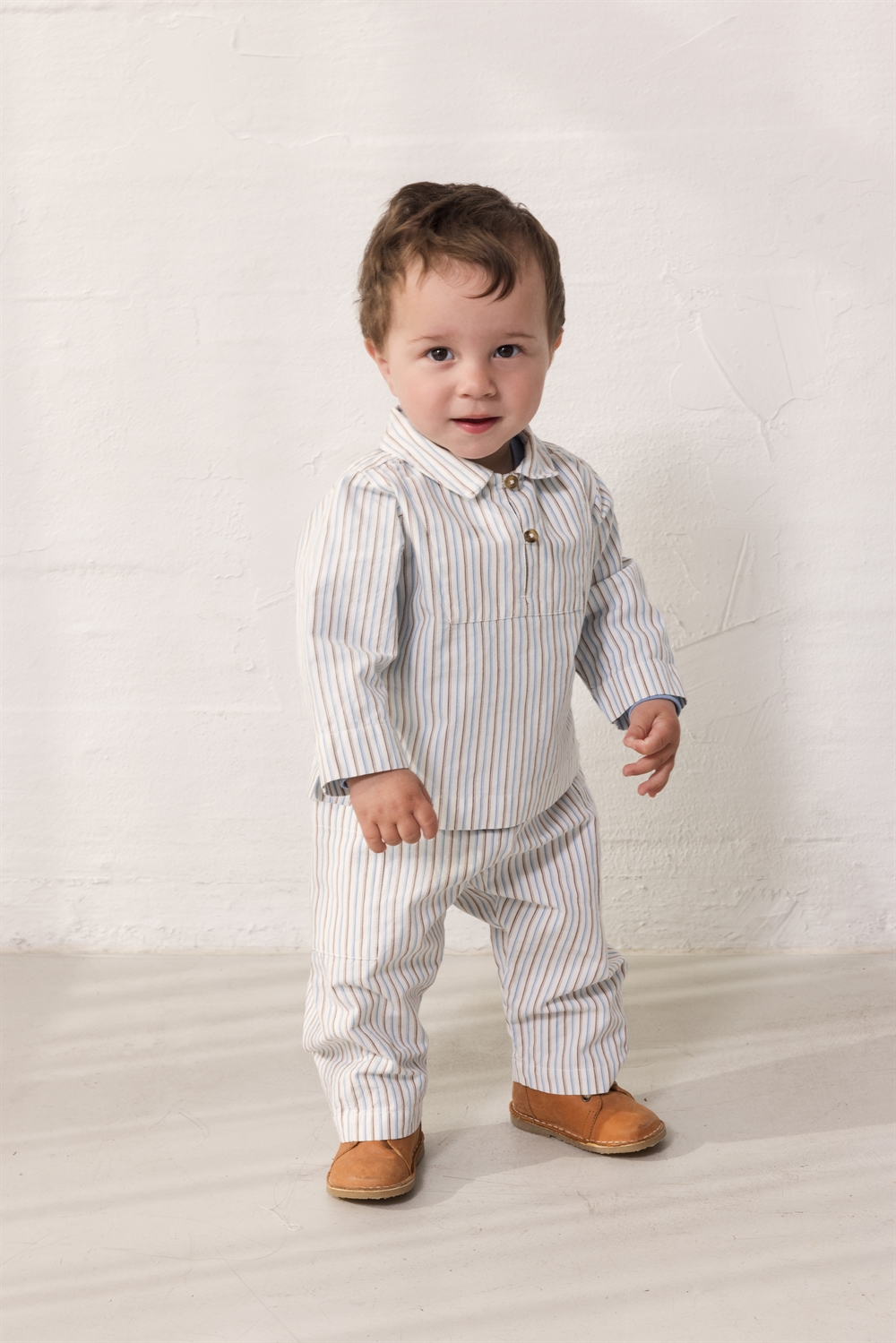 Bukserne er fremstillet i 100% bomuld og lover både holdbarhed og åndbarhed, hvilket gør dem ideelle til både leg og afslapning. Blue Iris Stripe er en levende og iøjnefaldende farve, der nemt kan matches med forskellige typer øvre beklædningsgenstande for et stilfuldt og sammenhængende look. Med det klassiske snit og det tidløse design vil disse bukser blive en fast favorit i dit barns tøjsamling.
