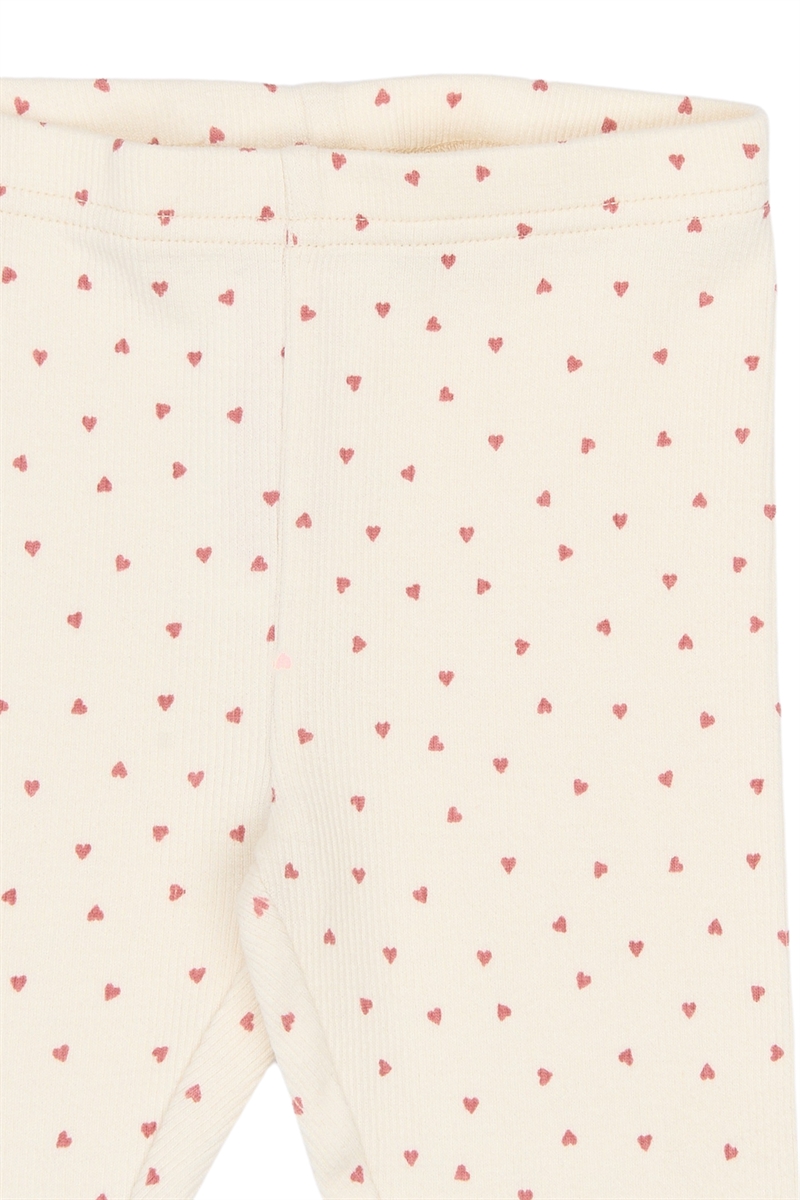 Fremstillet i en ultra-blød ribkvalitet, som føles behagelig mod huden, er disse leggins ikke kun praktiske men også utrolig stilfulde. Det fine hjerterprint tilføjer et sødt og legende touch, der gør dem ideelle til både hverdagsbrug og særlige anledninger.