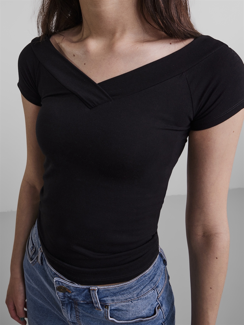 Produkttype: T-shirt Halsudskæring: V-hals Ærmer: Korte ærmer Stil: Off-shoulder Pasform: Stretch fitInvestér i Pieces Top Maliva og nyd en kombination af komfort og stil, der holder dag efter dag.
