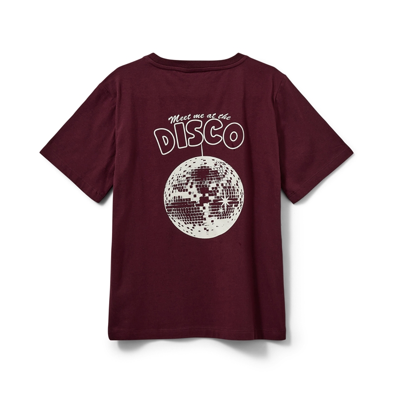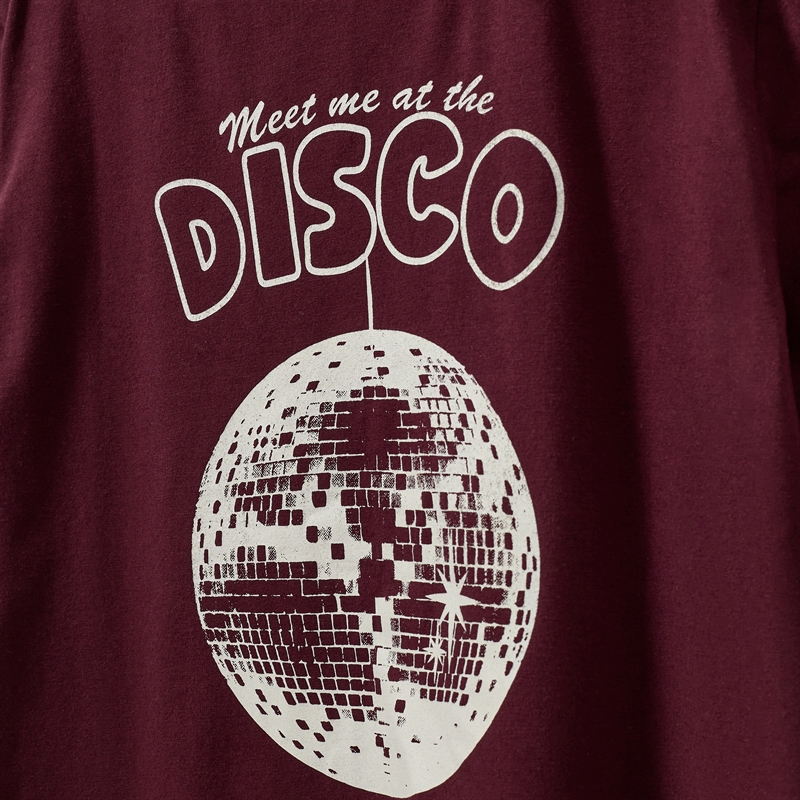 Denne T-shirt kombinerer en klassisk pasform med en rund halsudskæring, hvilket sikrer en flatterende og behagelig pasform for alle kropstyper. Fremhævet af et iøjnefaldende print med en funklende diskokugle på forsiden, tilføjer denne T-shirt et sjovt og festligt element til dit outfit.