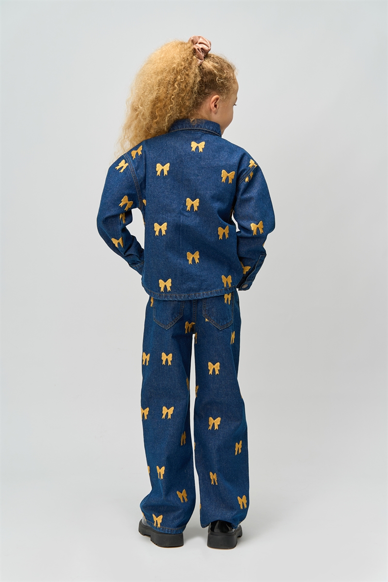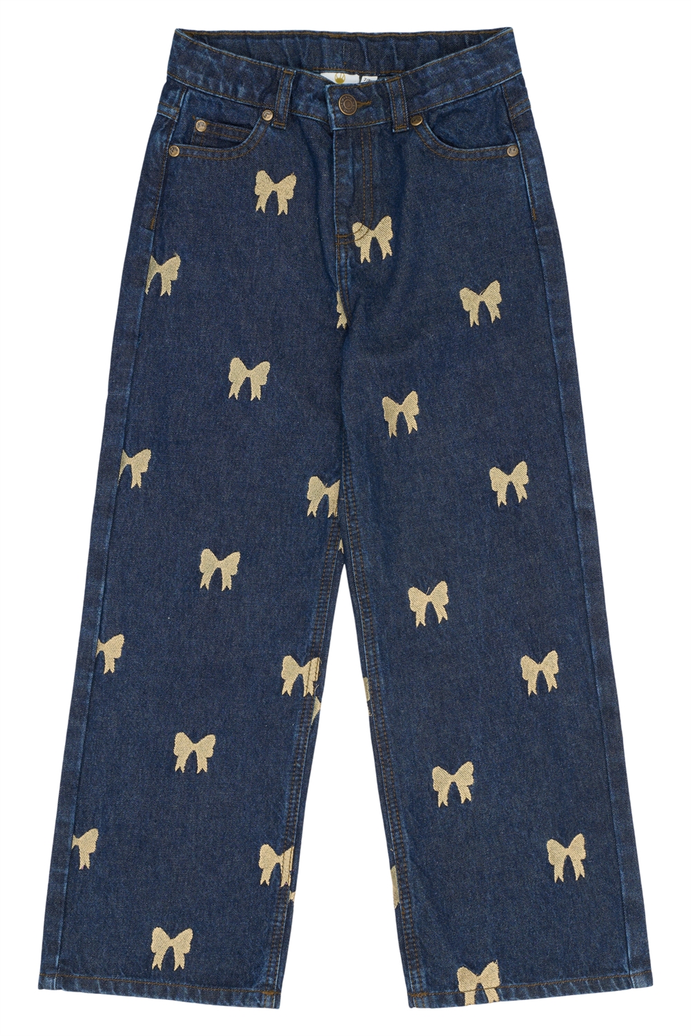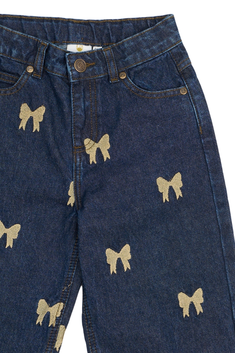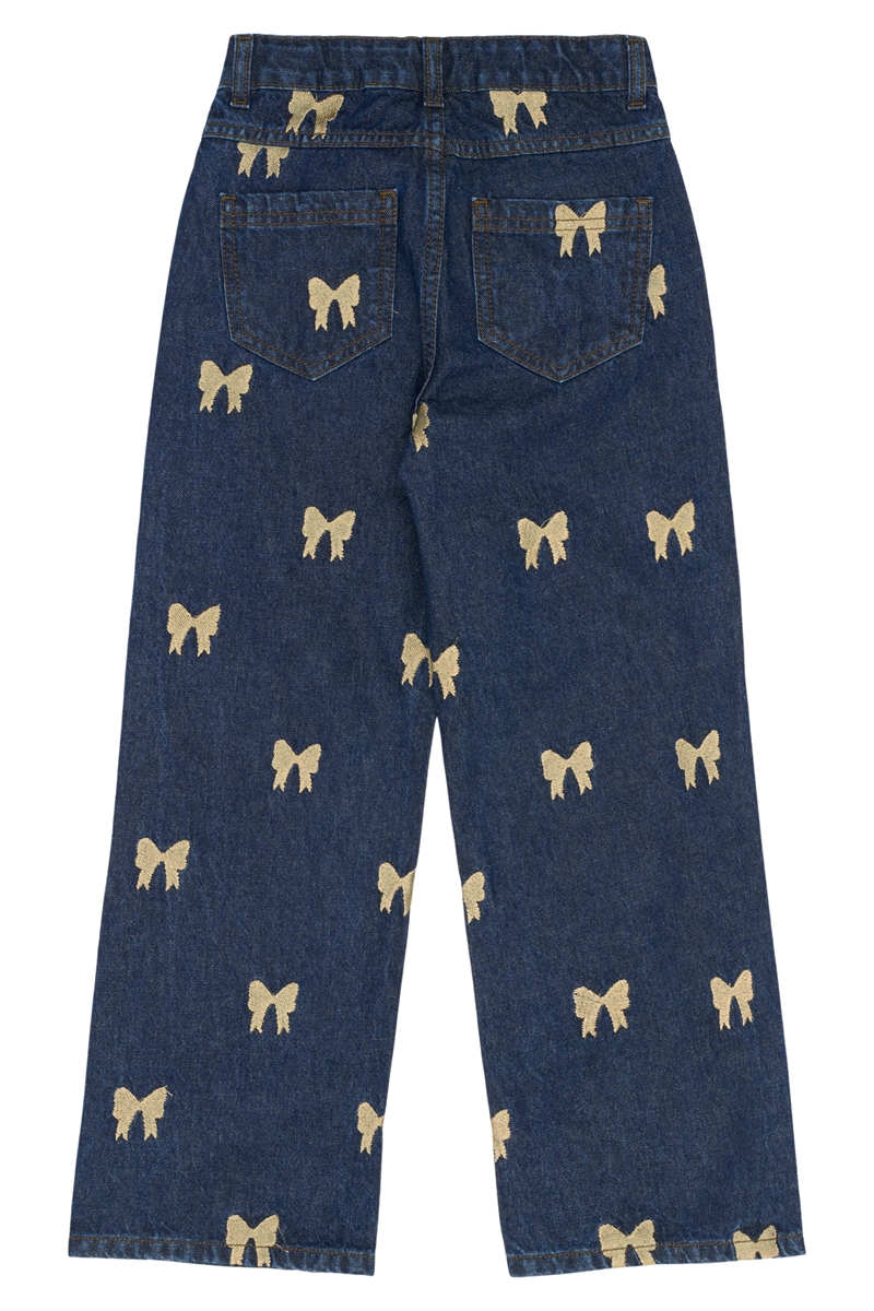 Produktegenskaber: - Unikt AOP (All-Over Print) med guldfarvede sløjfer, der tilfører et touch af glamour. - Bred pasform, der sikrer komfort og en afslappet silhuet, perfekt til lange dage. - Klassiske for- og baglommer kombinerer funktionalitet med et autentisk denim look.