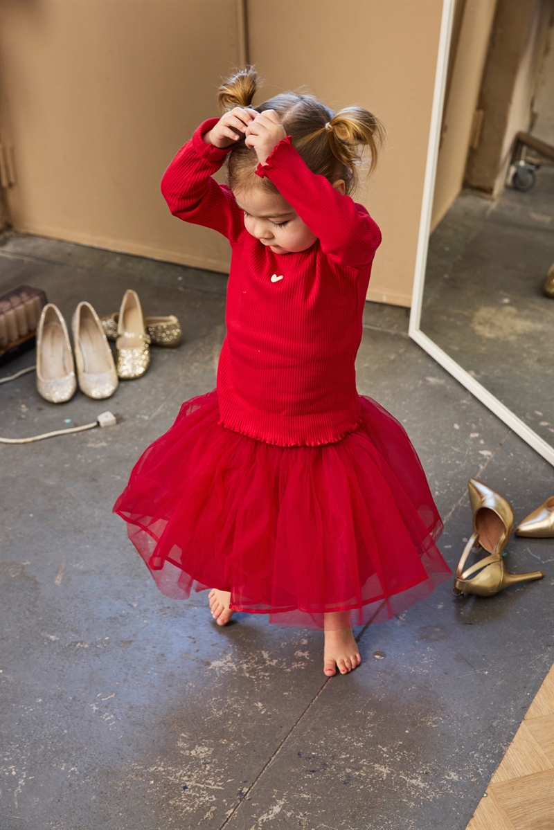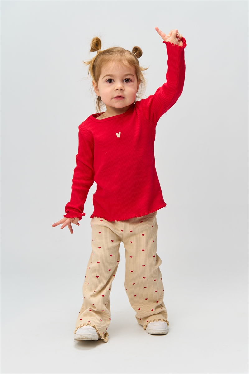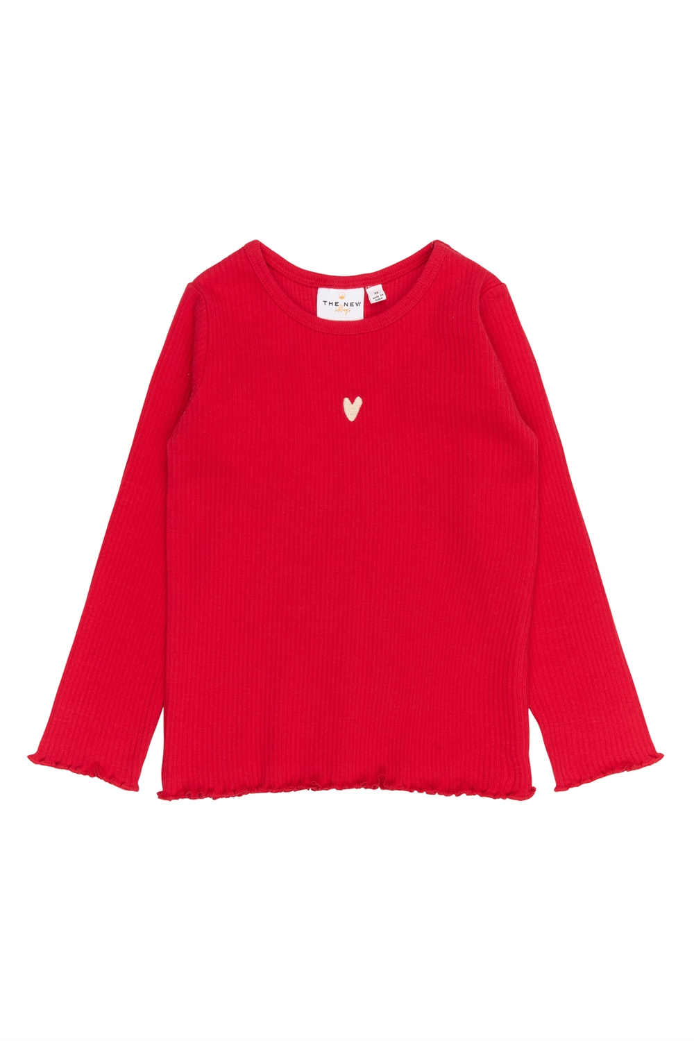 Denne langærmede T-shirt fra THE NEW Siblings er designet med øje for detaljer og hverdagskomfort. Den bløde og tætsiddende pasform gør den ideel til at kombinere med både bukser og nederdele, eller som et behageligt lag under en cardigan. T-shirten prydes af et sødt hjerteprint på brystet, som tilføjer et charmerende touch, mens de bølgede kanter på halsudskæringen, ærmerne og forneden giver et feminint og stilfuldt udtryk.