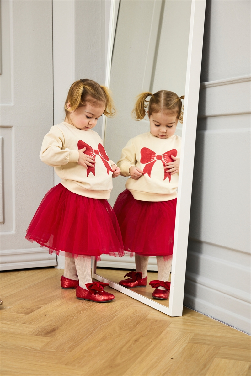 Denne stilfulde bluse er perfekt til børn, der ønsker at udtrykke sig med mode. Sweatshirten er fremstillet i en øjenfangende kombination af beige og med rødt motiv, hvilket gør den både levende og alsidig til forskellige outfits. Designet med omtanke for både komfort og stil, er Romalda Sweatshirten lavet af bløde, åndbare materialer, der sikrer din pige komfort hele dagen, uanset om hun er i skole eller leger med venner.