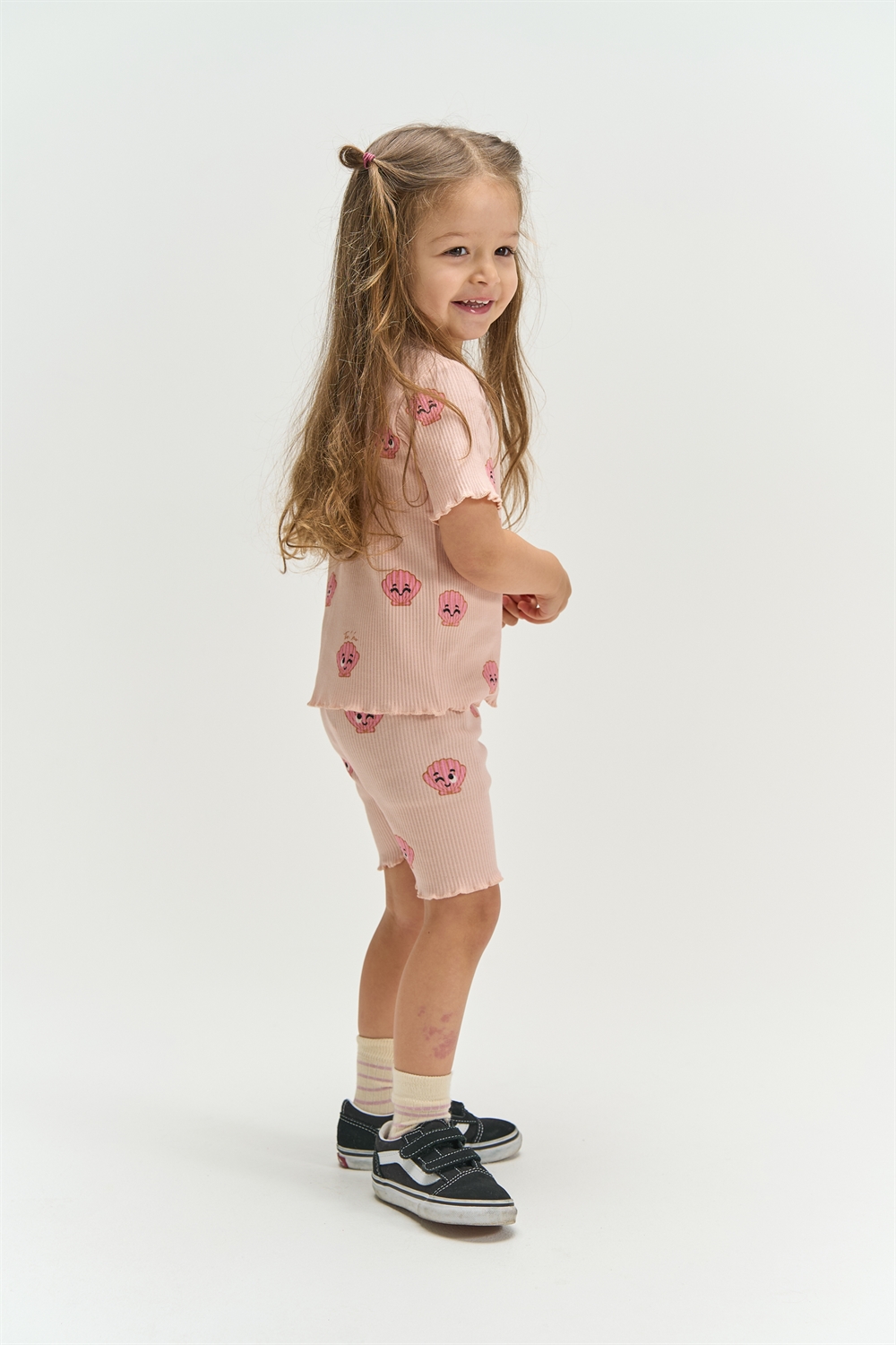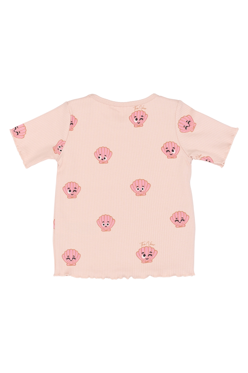 Den lyserøde base er dekoreret med et allover muslingeprint med små ansigter, som giver et unikt og børnevenligt udtryk. De fine salatkanter ved ærmer og bund tilfører et feminint touch, der gør t-shirten ekstra charmerende.