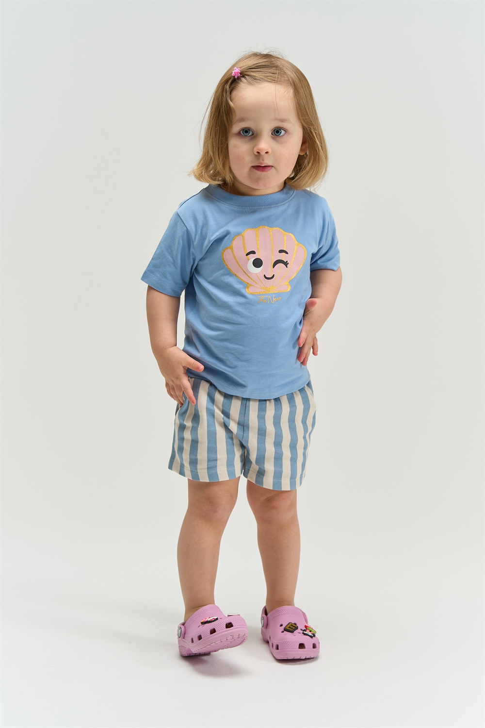 På forsiden finder du en sød, blinkende musling, som giver t-shirten et legende og strandinspireret udtryk. Et design der fanger børns fantasi og gør outfittet lidt sjovere.