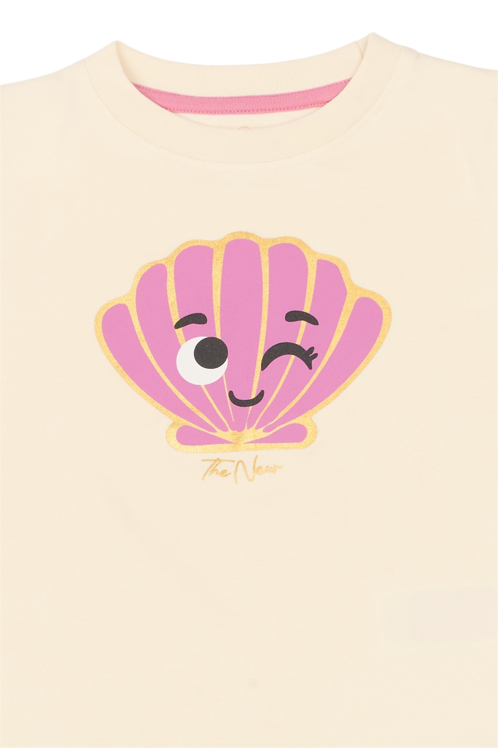 * Brand: The New Siblings * Type: Kortærmet t-shirt * Målgruppe: Små piger * Materiale: 95% økologisk bomuld, 5% elastan * Farve: Gardenia (beige) * Print: Muslingemotiv på front * Hals: Rund hals