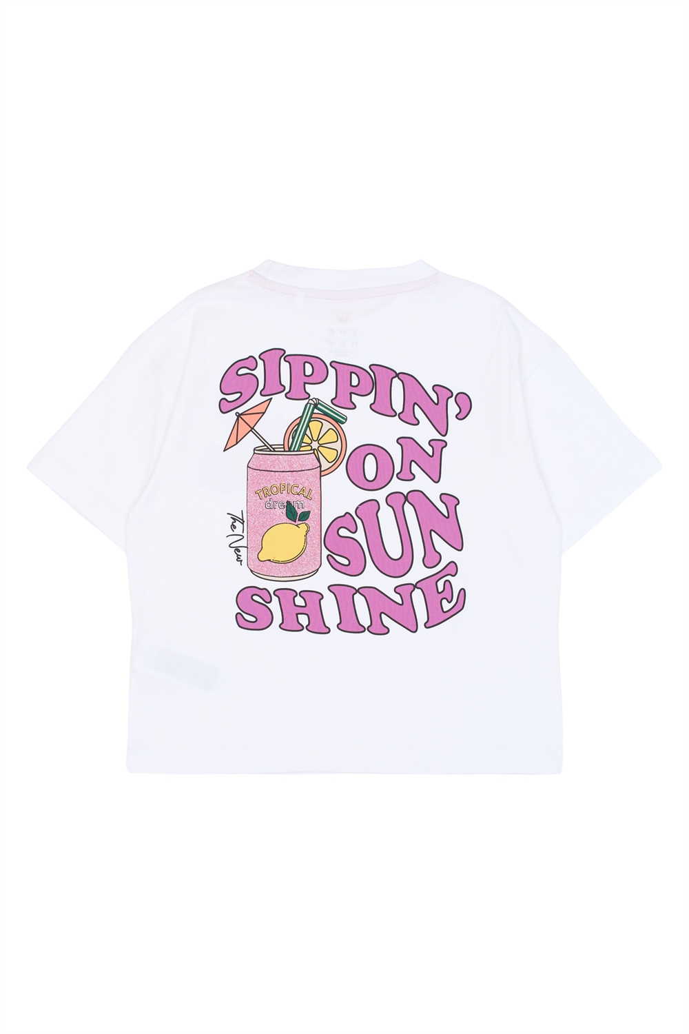 Det farverige brystprint med tropiske frugter og en sjov drik giver The New Tarla T-shirt et livligt og sommerligt look. Det er en t-shirt, der skiller sig ud og tilfører personlighed til ethvert outfit – perfekt til piger, der elsker farver og sjove detaljer.
