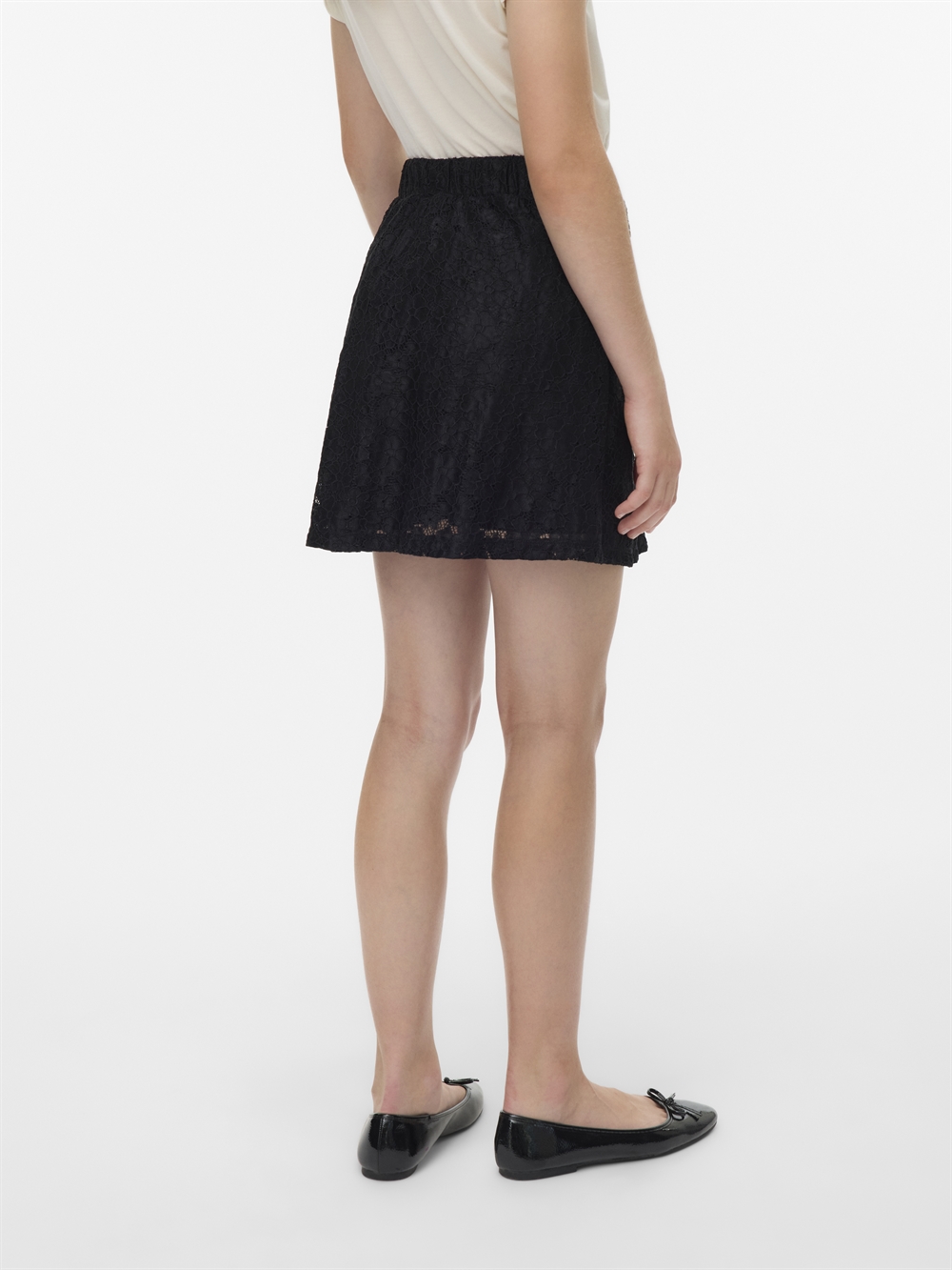 Denne nederdel er et must-have i enhver ung piges garderobe, med dens alsidighed og tidløse sort farve. Den elastiske talje sikrer en behagelig pasform, mens blonddetaljerne tilføjer et touch af femininitet.