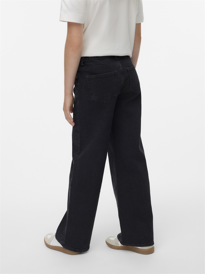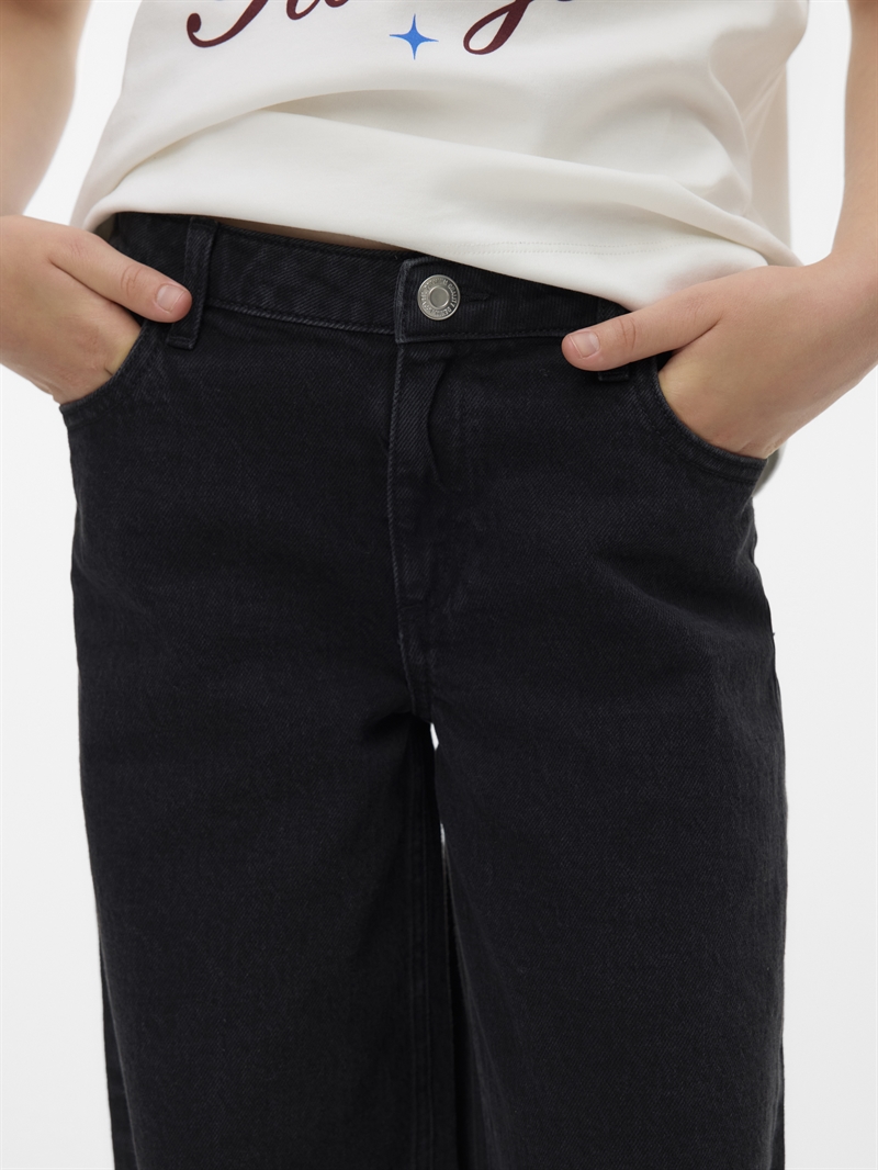 Vero Moda Girl Tessa - Black' er designet specielt til piger, der elsker mode og ønsker at udtrykke sig gennem deres stil. Med højtaljede jeans i bred pasform tilbyder disse jeans både stil og funktionalitet, idet de har praktiske lommer og sikker lukning med knap og lynlås.