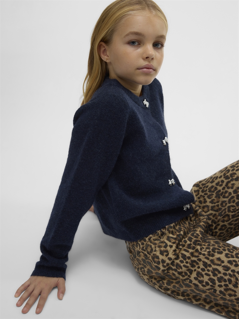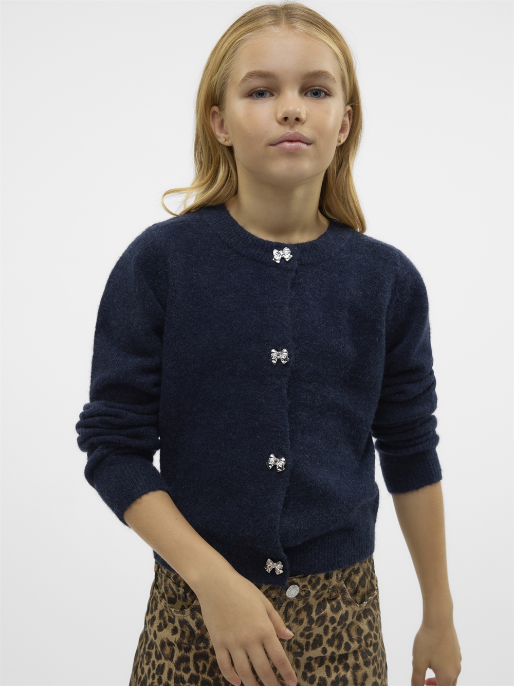 Opdag den stilfulde og funktionelle 'Vero Moda Girl Strik Cardigan Fiona - Dark Denim', en uundværlig tilføjelse til enhver pige garderobe.