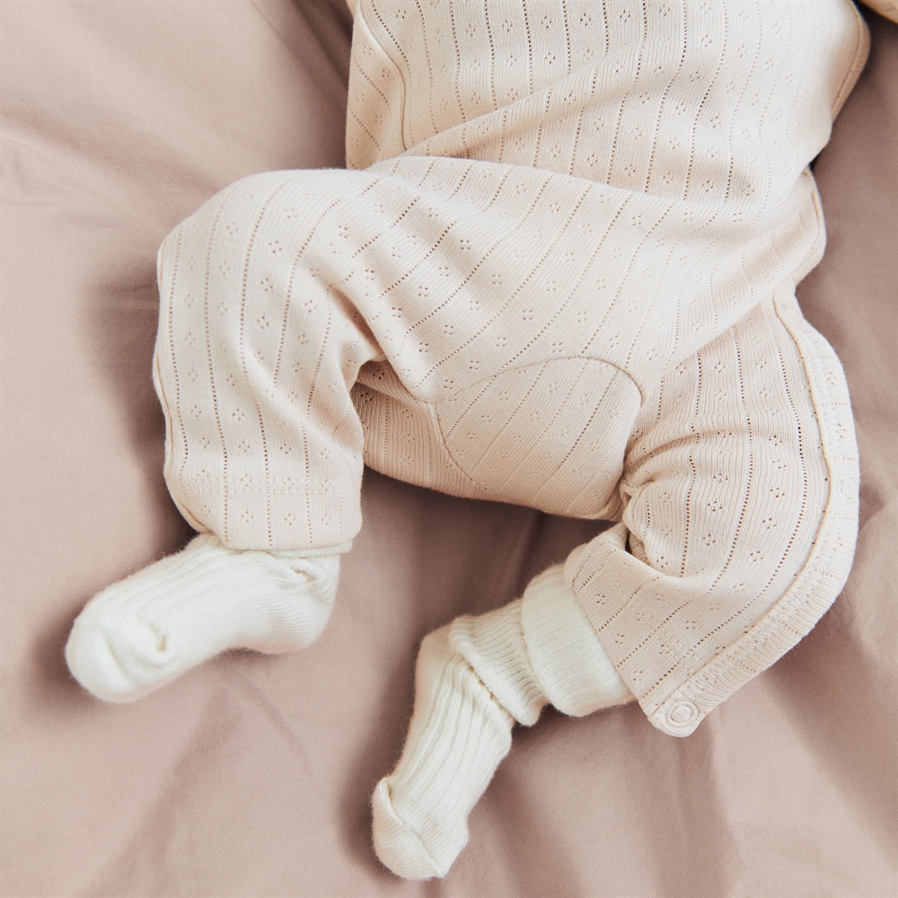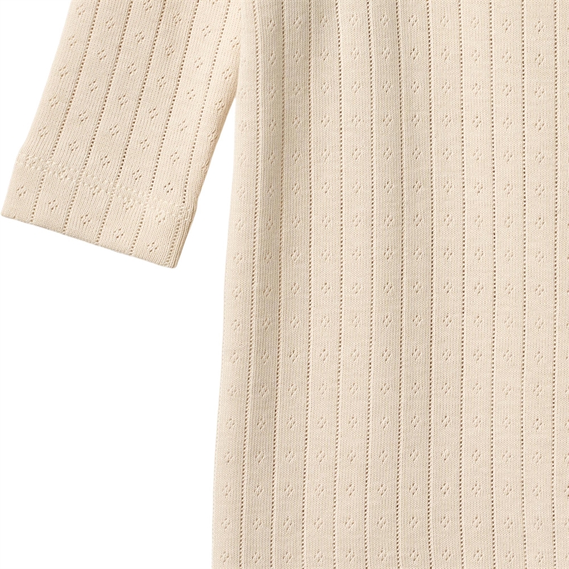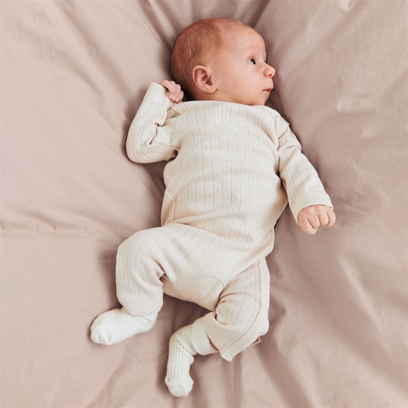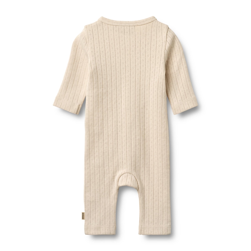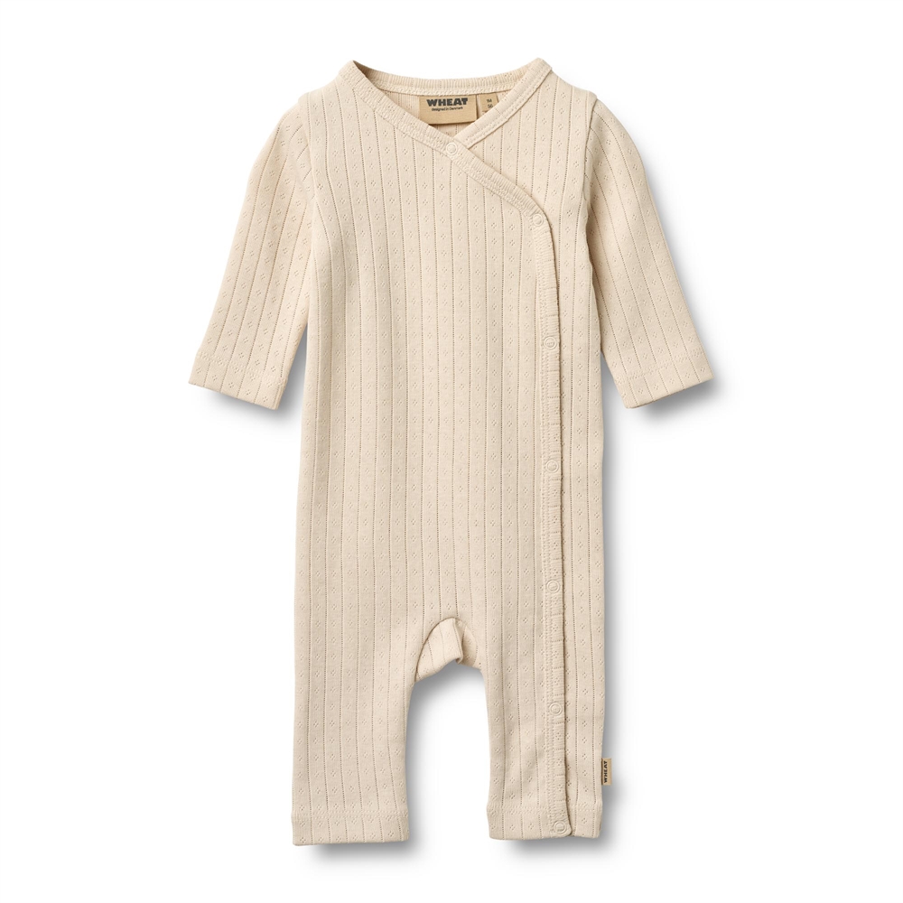 Dette langærmede wraparound heldragt er fremstillet af blødt økologisk bomuldspointelle og designet til at omfavne din lille skat med både komfort og stil. Det bløde pointelle-mønster tilføjer en fin detalje, mens ribstrukturen sikrer en behagelig pasform, der tilpasser sig babyens bevægelser. Den praktiske design inkluderer trykknapper ned foran og langs indersømmen, hvilket gør det nemt at skifte ble og tøj.